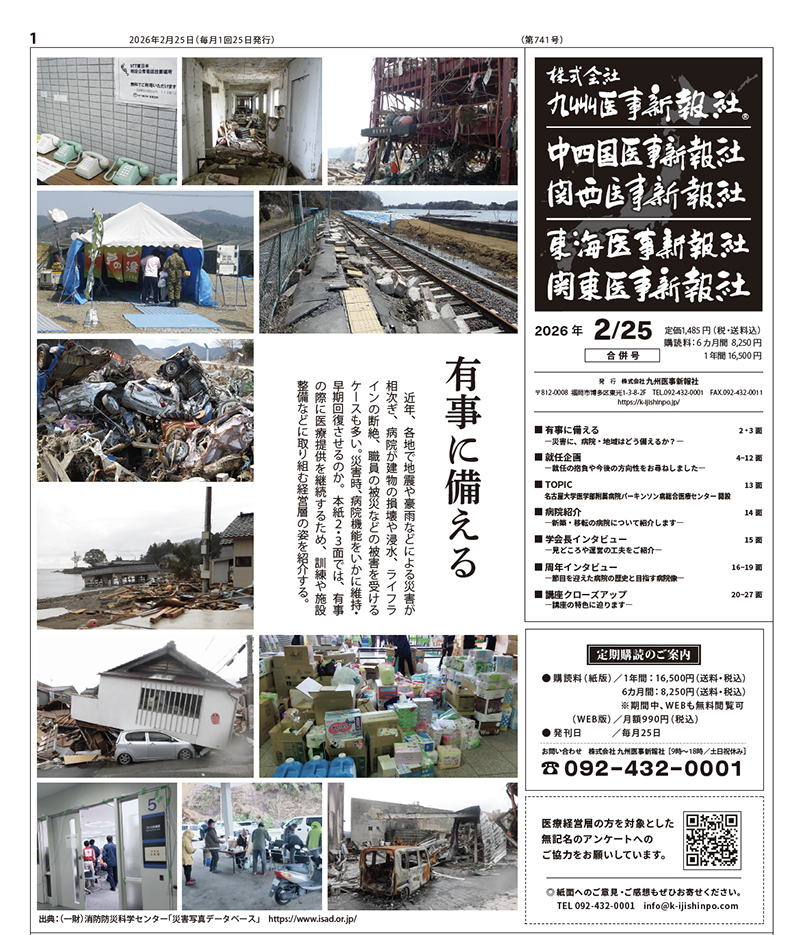 近年、各地で地震や豪雨などによる災害が相次ぎ、病院が建物の損壊や浸水、ライフラインの断絶、職員の被災などの被害を受けるケースも多い。災害時、病院機能をいかに維持・早期回復させるのか。本紙2・3面では、有事の際に医療提供を継続するため、訓練や施設整備などに取り組む経営層の姿を紹介する。