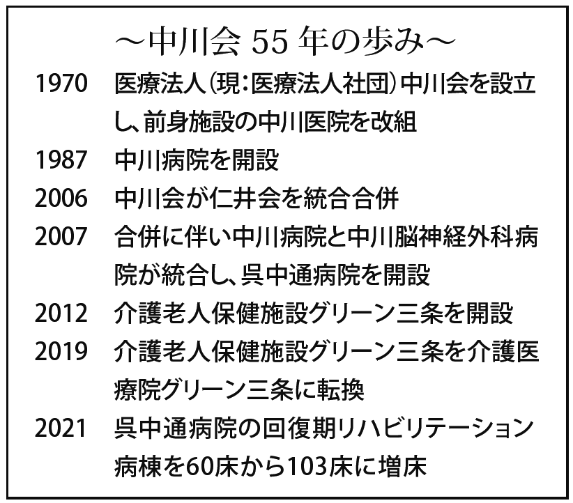 投稿公開日:2025-09-25投稿カテゴリー:中四国 / 周年記念医療法人社団 中川会 創立55周年 中川 寛顕(なかがわ・ひろあき)理事長に聞く 広島県呉市で、回復期を担う「呉中通病院」と、介護医療院「グリーン三条」の2施設を運営する医療法人社団中川会が、創立55周年を迎えた。地域の医療・福祉のニーズに応えてきた同会の歴史と現在、今後の展望を中川寛顕理事長に聞いた。