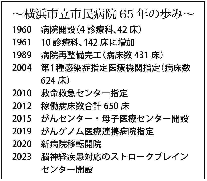 投稿公開日:2025-09-25投稿カテゴリー:周年記念 / 関東・甲信越横浜市立市民病院 創立65周年 中澤 明尋(なかざわあきひろ)病院長に聞く 横浜市民の命を守る拠点として誕生した横浜市立市民病院が65周年を迎える。高度急性期医療をはじめ、周産期・小児医療、感染症医療などの政策的医療に対応し、地域医療の最後のとりでとして歩んできた歴史と今後の展望を中澤明尋病院長に聞いた。