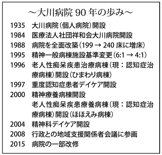 投稿公開日:2025-10-25投稿カテゴリー:九州・沖縄 / 周年記念大川病院 創立90周年 大川 順司(おおかわ・じゅんじ)理事長に聞く 1935年の創立から精神科医療で地域を支えてきた福岡県豊前市の大川病院。時代の要請を受けて認知症医療に重心を移し、コロナ禍では大きな試練を乗り越えた。その歴史と今後の展望について、運営する医療法人社団祥和会の大川順司理事長に聞いた。