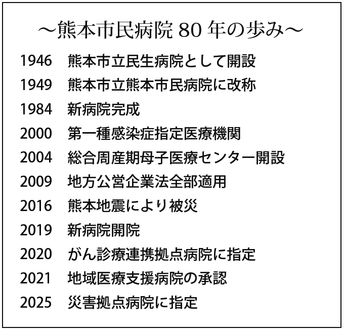 投稿公開日:2026-02-25投稿カテゴリー:九州・沖縄 / 周年記念熊本市立熊本市民病院 創立80周年 相良 孝昭(さがら・たかあき)院長に聞く 1946年に熊本市立民生病院として開設された熊本市民病院は、2026年2月に創立80周年を迎えた。熊本地震からも復興を遂げ、地域医療の中核を担う病院として発展してきた。その歴史や今後の取り組みなどを院長の相良孝昭氏に伺った。